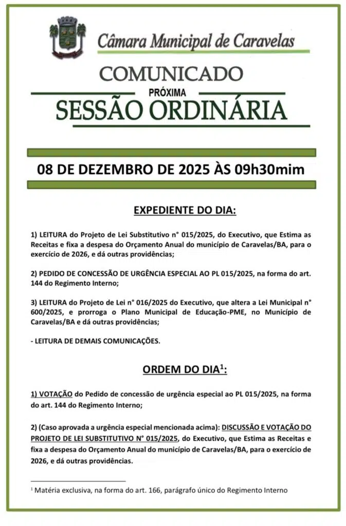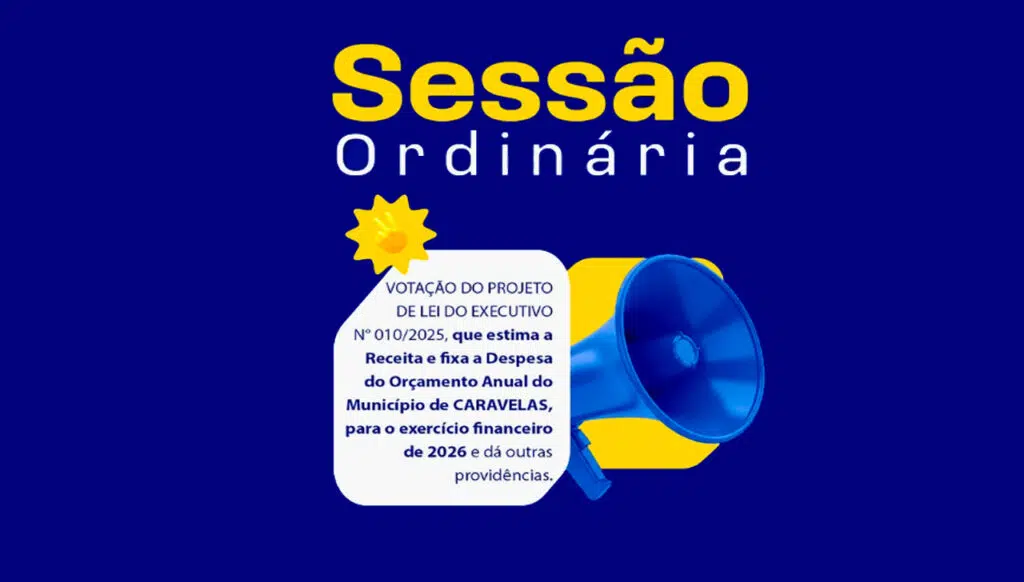 A próxima sessão ordinária da Câmara Municipal de Caravelas, marcada para esta segunda-feira, 17 de novembro de 2025, às 9h30, terá como pauta a apreciação de matéria exclusiva, conforme previsto no Artigo 166 do Regimento Interno, da votação do Projeto de Lei do Executivo nº 010/2025, que estima a receita e fixa a despesa do Orçamento Anual do Município de Caravelas para o exercício financeiro de 2026. O projeto também prevê outras providências relacionadas à gestão fiscal do próximo ano.